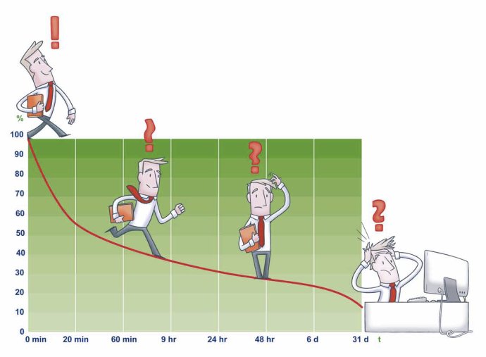德国心理学家艾宾浩斯(H.Ebbinghaus)研究发现,遗忘在学习之后立即开始,而且遗忘的进程并不是均匀的。最初遗忘速度很快,以后逐渐缓慢。他认为"保持和遗忘是时间的函数",并根据他的实验结果绘成描述遗忘进程的曲线,即著名的艾宾浩斯记忆遗忘曲线。